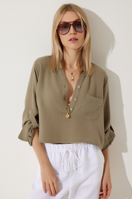 Hakim yaka, düğmeli, tek cepli, kolları ayarlanabilir düğmeli, premium gömlek bluz