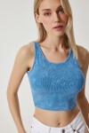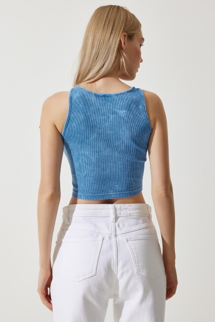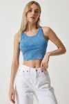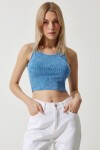 Halter yaka, esnek yapılı, taşlama detaylı crop örme bluz