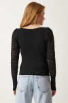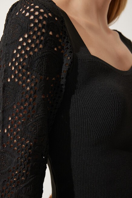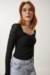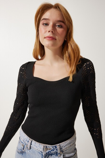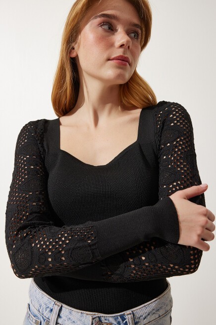 Kalp yaka, ajurlu kol detayı, esnek yapılı, fitilli triko bluz