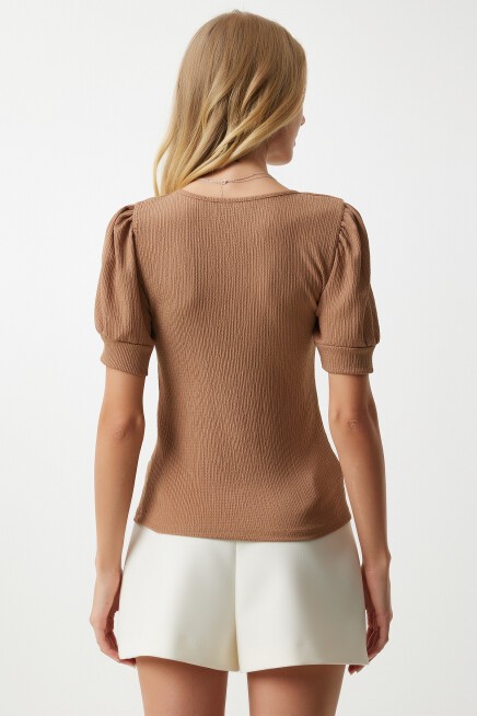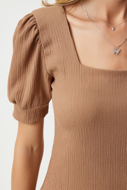 KARE YAKA BALON KOLLU ÖRME BLUZ