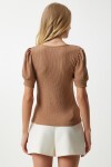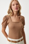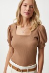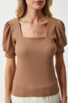 Kare yaka, balon kollu, manşetli örme bluz