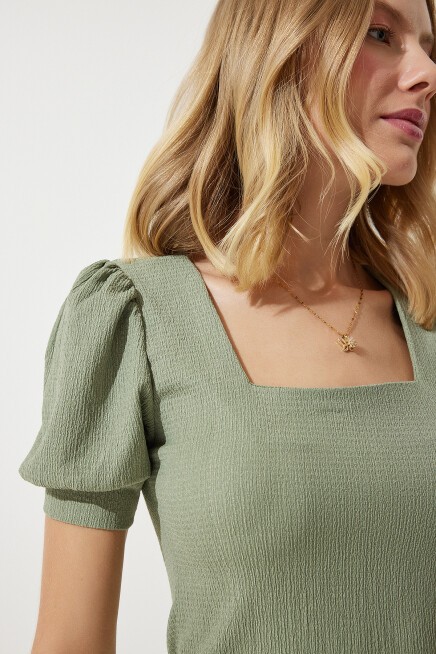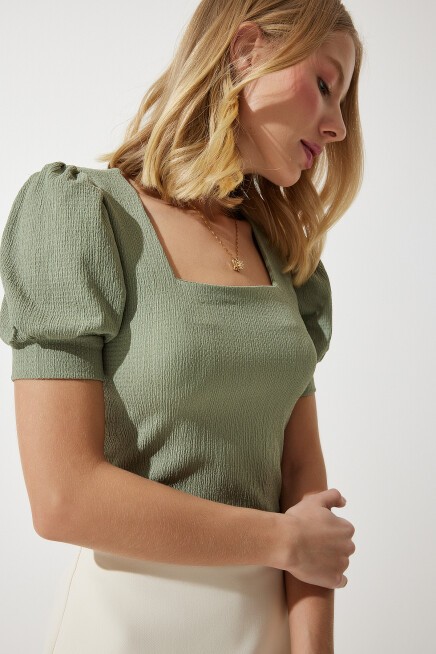 KARE YAKA BALON KOLLU ÖRME BLUZ