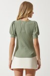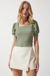 Kare yaka, balon kollu, manşetli örme bluz