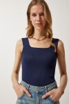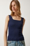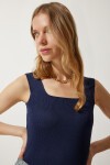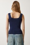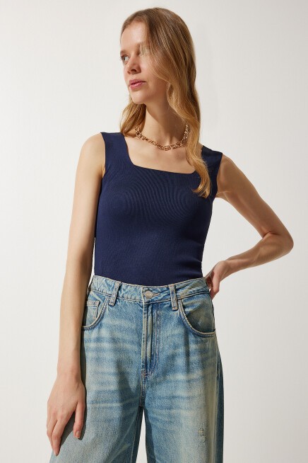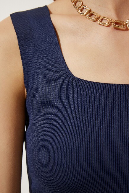 Kare yaka, kalın askılı, sık dokulu, esnek yapılı crop triko bluz