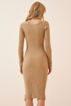 Kare yaka, uzun kollu, yırtmaçlı triko elbise.