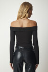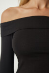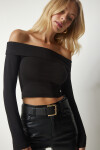 Katlı carmen yaka, uzun kollu, örme crop bluz