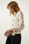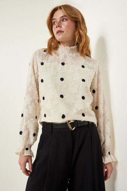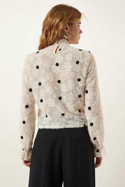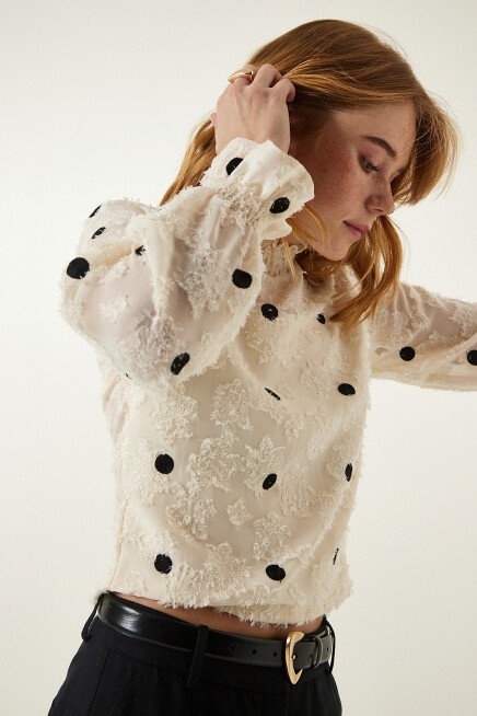 Arkadan düğme kapamalı dik yaka, uzun kollu, kırçıllı, kolları hafif transparan, puantiyeli dokuma bluz