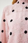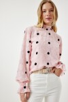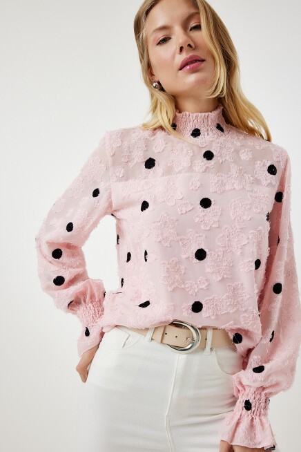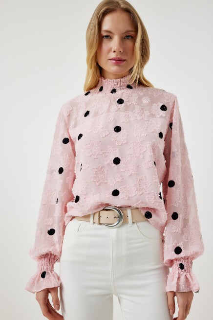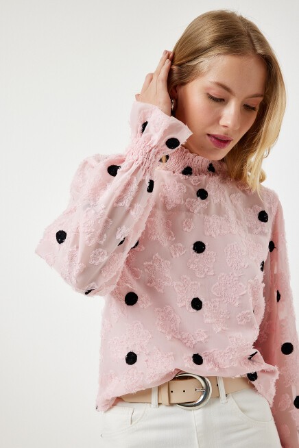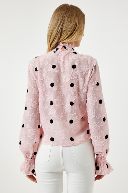 Arkadan düğme kapamalı dik yaka, uzun kollu, kırçıllı, kolları hafif transparan, puantiyeli dokuma bluz