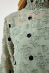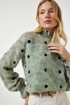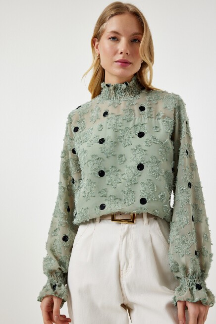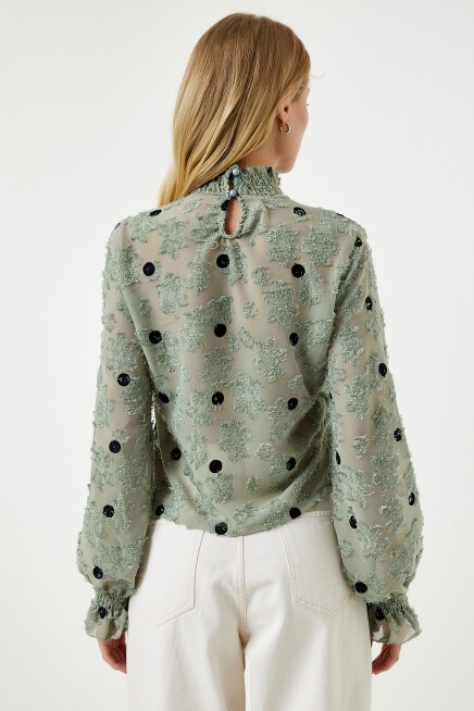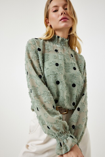 Arkadan düğme kapamalı dik yaka, uzun kollu, kırçıllı, kolları hafif transparan, puantiyeli dokuma bluz