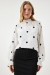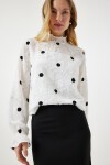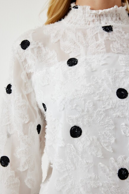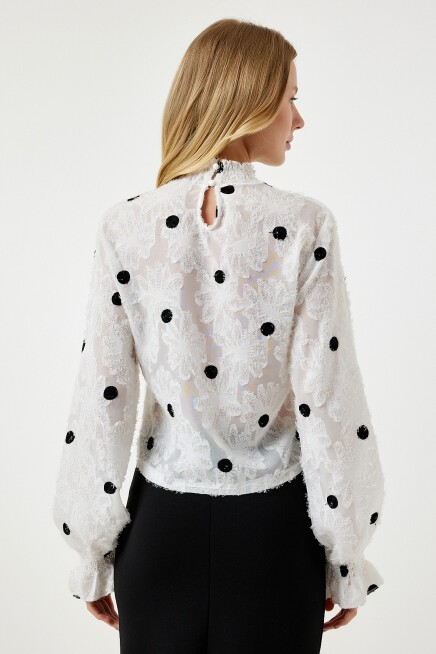 Arkadan düğme kapamalı dik yaka, uzun kollu, kırçıllı, kolları hafif transparan, puantiyeli dokuma bluz