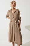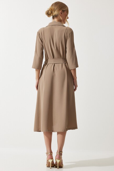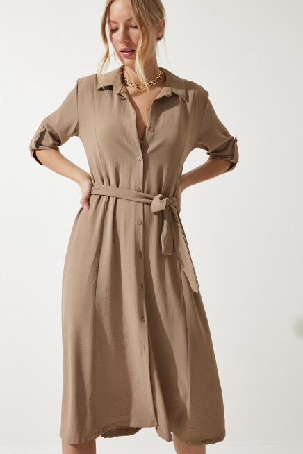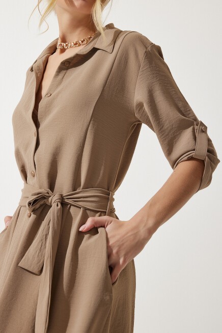 Düğme kapamalı, 4/3 ayarlanabilir kol, astarsız, yanlardan cepli, kuşaklı gömlek elbise