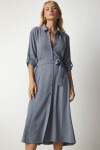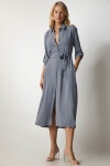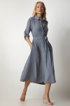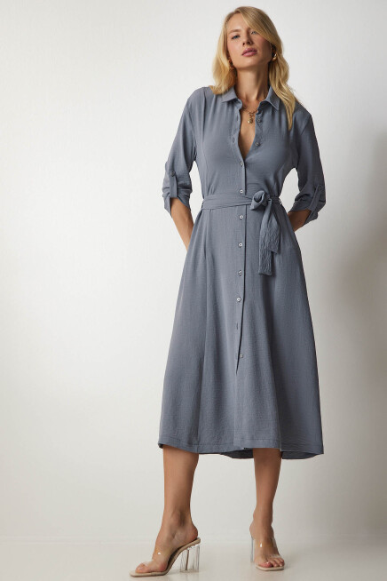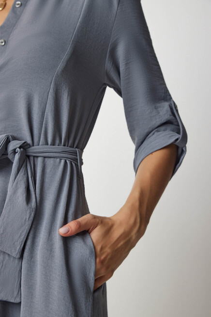 Düğme kapamalı, 4/3 ayarlanabilir kol, astarsız, yanlardan cepli, kuşaklı gömlek elbise