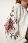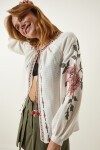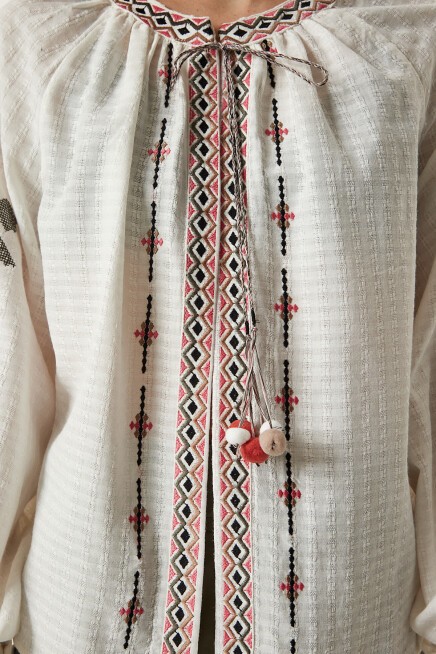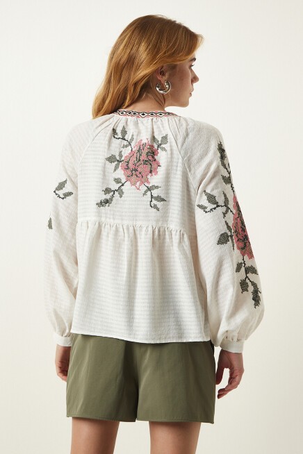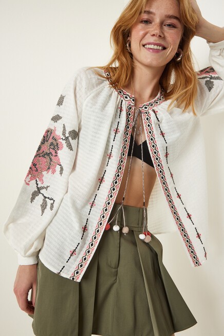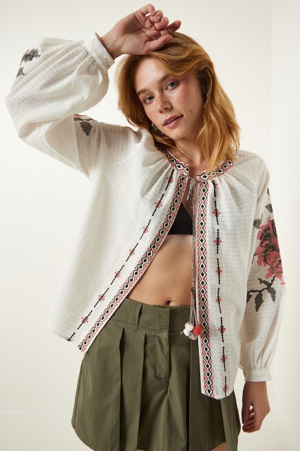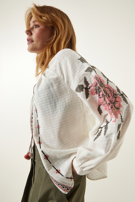 Bisiklet yaka, reglan kesim balon kol, manşetleri düğmeli, nakış detaylı, bağlamalı keten bluz
