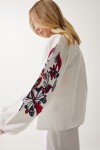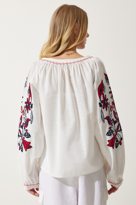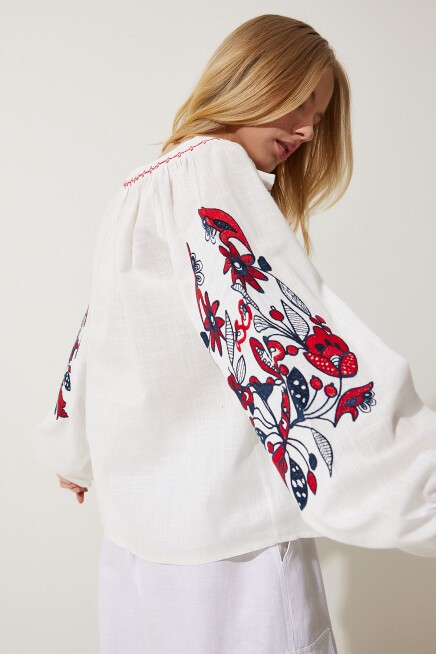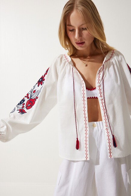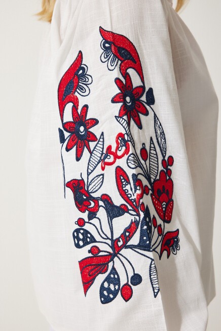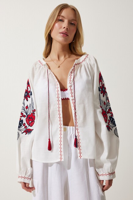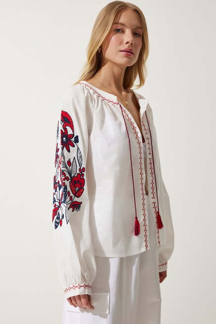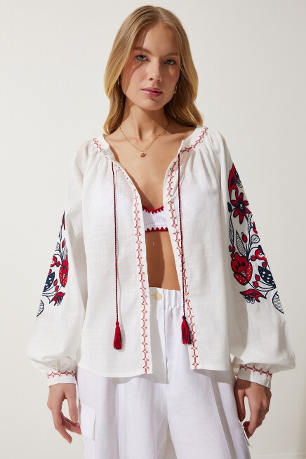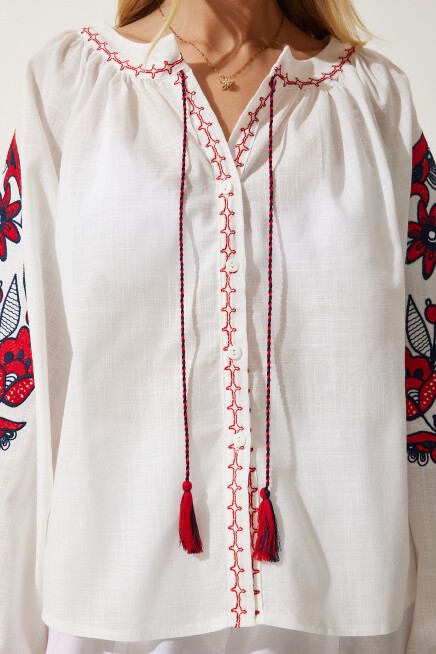 Bağlamalı V yaka, geniş kesim reglan kol, düğme kapamalı, nakışlı keten yüzeyli bluz