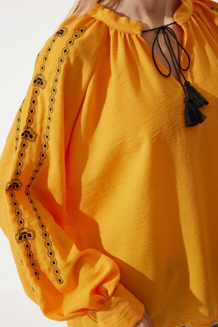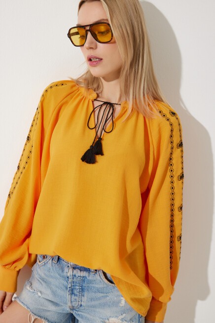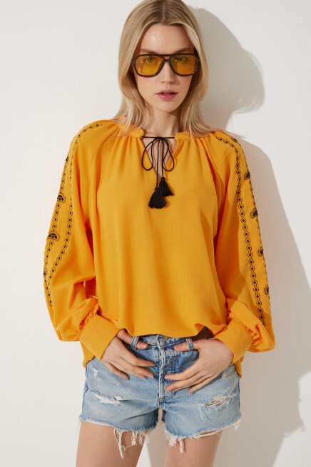 NAKIŞLI OVERSİZE KETEN BLUZ