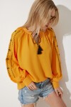 Püskül ipli V yaka, uzun manşetli, bol, dökümlü, rahat kalıp keten bluz