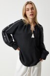 Püskül ipli V yaka, uzun manşetli, bol, dökümlü, rahat kalıp keten bluz