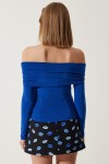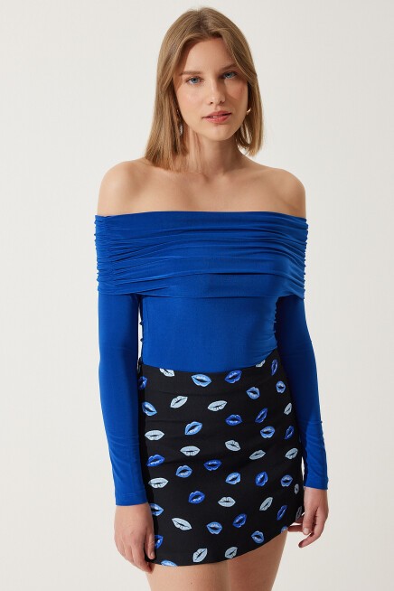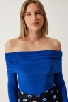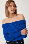 Omuzları açık, büzgü detaylı, carmen yaka, uzun kollu, viskon örme bluz