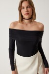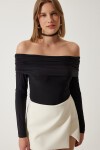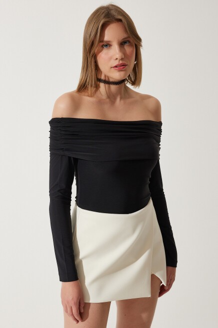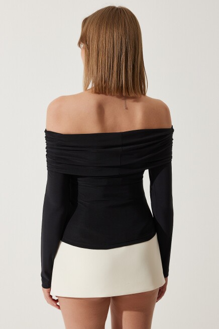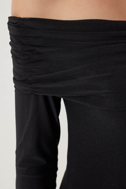 Omuzları açık, büzgü detaylı, carmen yaka, uzun kollu, viskon örme bluz