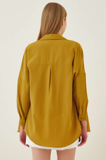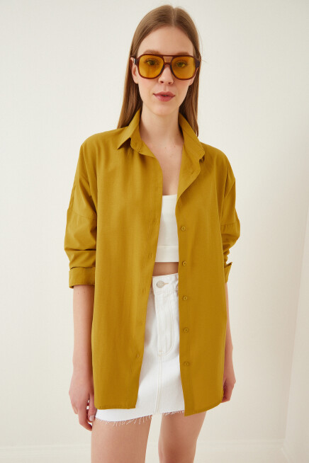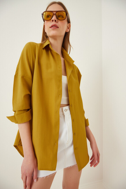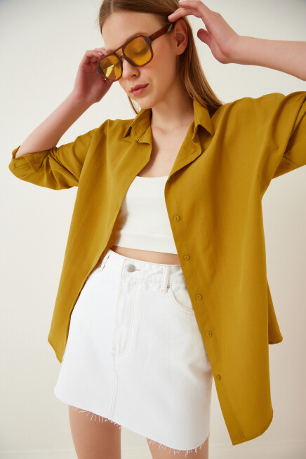 Oversize, uzun, kenarları oval kesim, rahat kalıp gömlek.