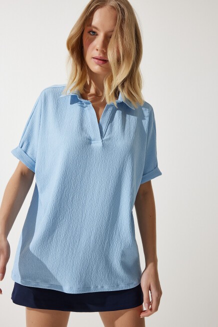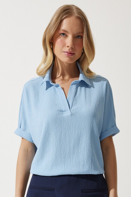 Polo yaka, düşük omuzlu, esnek yapılı, geniş kesim, örme krinkıl bluz