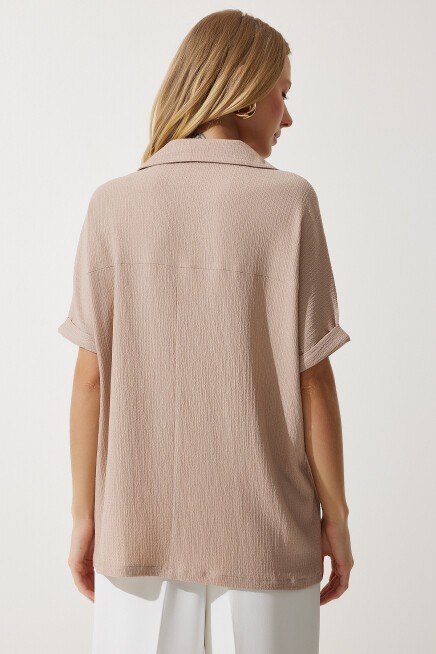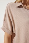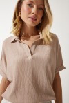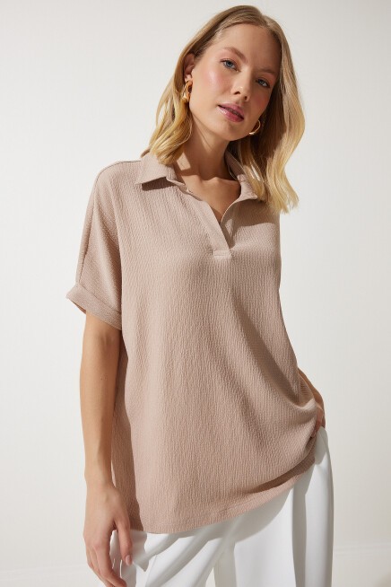 Polo yaka, düşük omuzlu, esnek yapılı, geniş kesim, örme krinkıl bluz