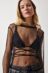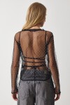 Bisiklet yaka, uzun kollu, esnek yapılı, taş detaylı, transparan örme bluz