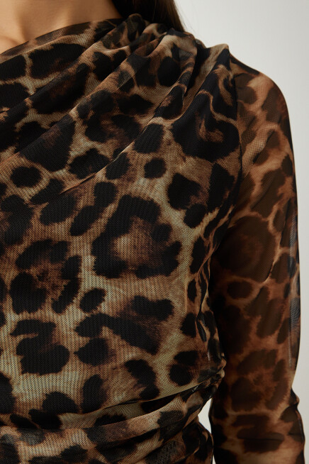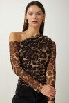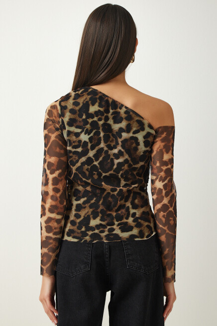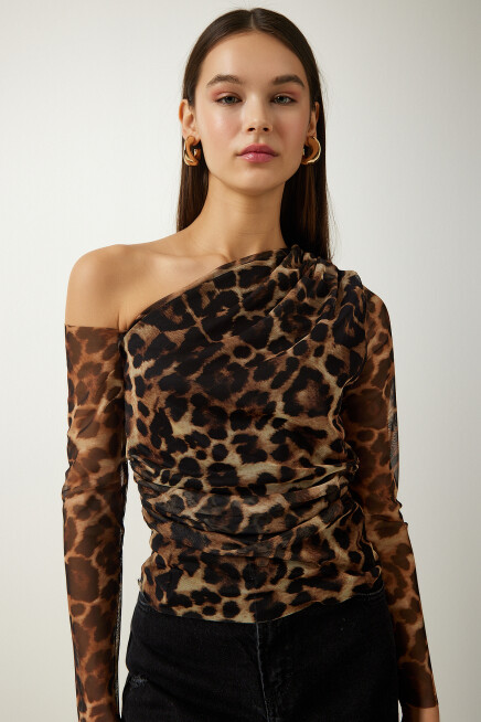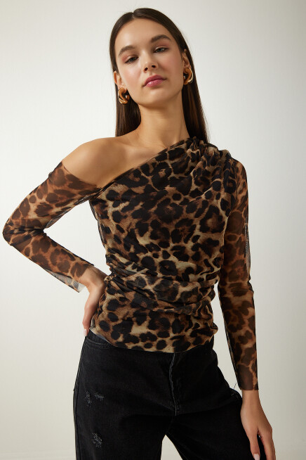 Asimetrik yaka, tek kol, büzgü detaylı, esnek yapılı şifon bluz
