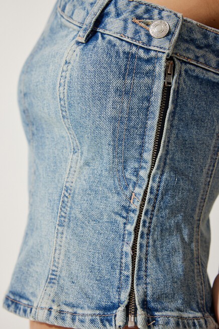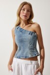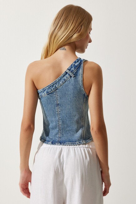 Tek omuz, yandan düğme ve fermuar kapamalı, belden oturtmalı denim bluz
