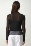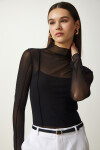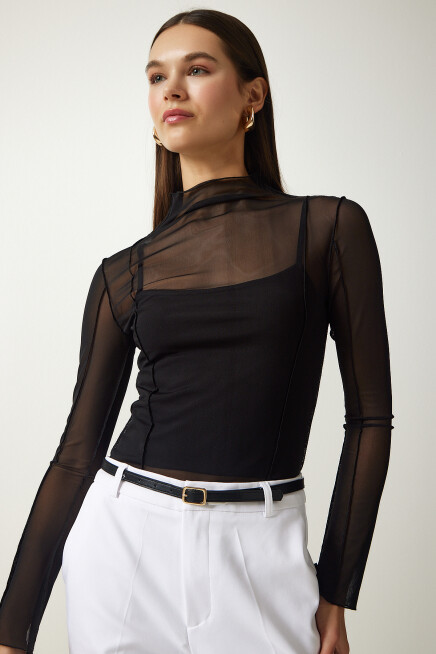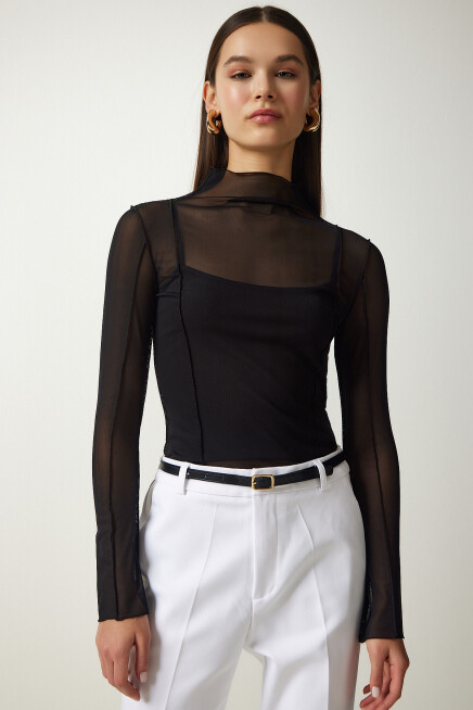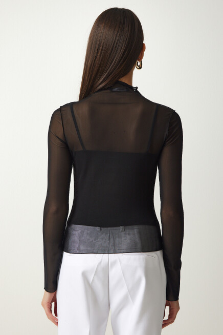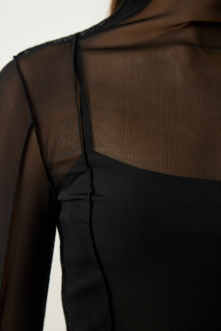 Dik yaka, esnek yapılı, atletli, transparan şifon bluz