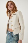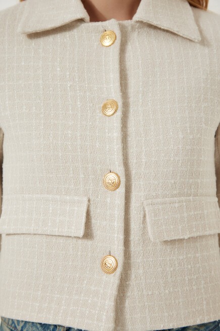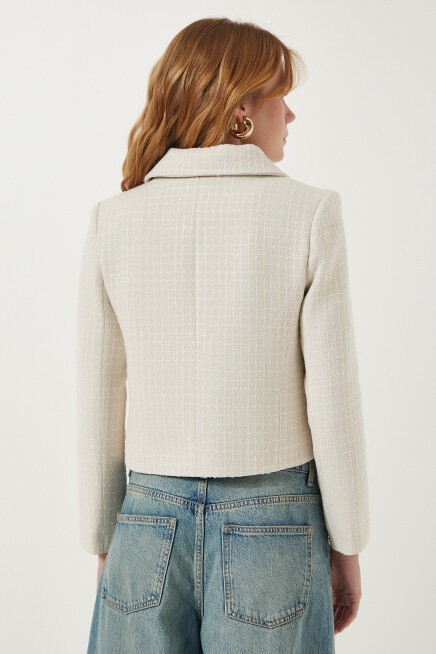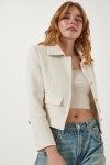 Polo yaka, vatkalı, sahte kapaklı cepsiz, metal düğmeli, astarlı, crop tüvid blazer ceket.