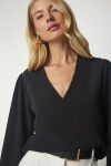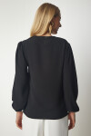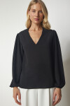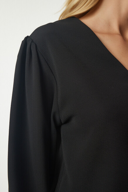 V yaka, hafif büzgülü omuz detayı, dökümlü krep bluz