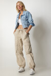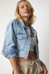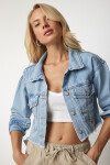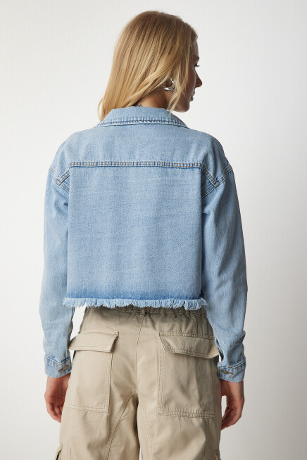 Gömlek yakalı, kenarları hafif püsküllü, düğme kapamalı, ön düğmeli cepli, crop denim ceket